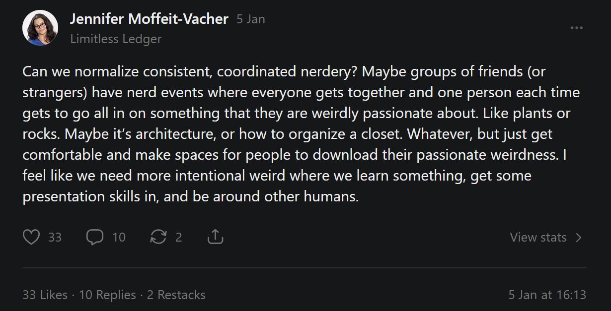 I asked on the notes in Substack and on LinkedIn about the idea of coordinated nerdery. How can we build better spaces for people to just deep dive into whatever topic, without caring if it gets them revenue or leads, just because they love whatever it is they are talking about.